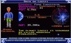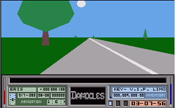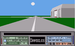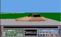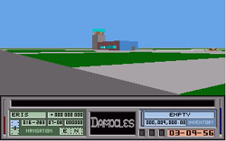 sequel to the 8 BIT unclassic Mercenary. A full 3D experience very similar to Grand Theft Auto III. You can go anywhere, do anything and have sex in the back of your car with the hookers. Except, there are very few vehicles to steal, nothing much to do and no people (or hookers). I'm glad the ST emulator has a fast forward key because it seemed like a new Ice Age was developing while I waited for the intro to pass. Next, walking from the spaceship you've just landed in to the nearby base for the key to your car. The action was unintense. The fun started when I finally got into the car due to the fact I couldn't find the keys to start it. The function buttons got it going backward so I drove blind down the nearest road. There could have been nuns ahead. Pressing a number key suddenly brought the car back into forward motion - hurray! After testing the number keys I found impossible speeds could be attained, which is just as well because it was 10 minutes to the next house (at light speed). A triangle shaped craft await, my heart started thumping with excitement, there was a building, inside was no key. Bastard. This was where my game ended. I think the idea is to stop an asteroid hurtling into Earth within 2 hours. During this 2 hours you can go anywhere, including various other planets. Major plot mistake: You start in a space-ship. Surely it would be safer to stay in the space-ship and maybe travel away from Earth. There's no-one there anyway. They must have departed in Battlestar Galactica. |